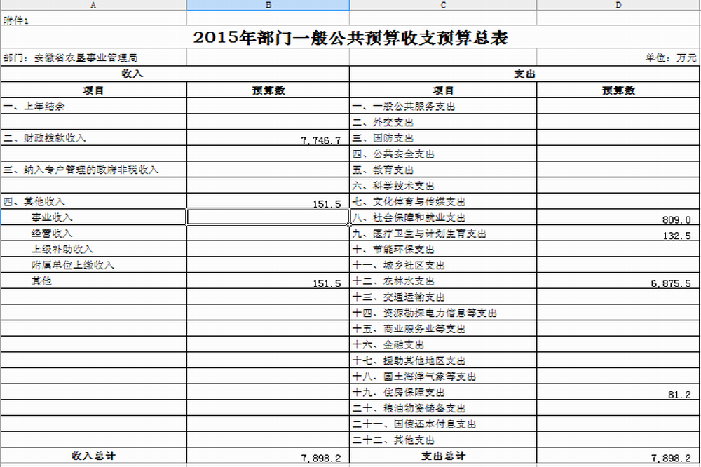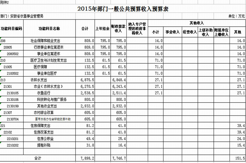安徽省农垦事业管理局2015年收入预算7898.2万元,其中:财政拨款收入7746.7万元,占98.1%;其他收入151.5万元,占1.9%
