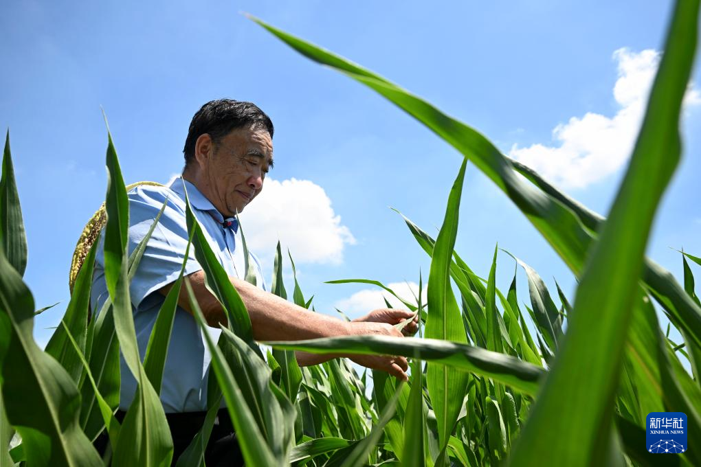 7月20日,徐淙祥在阜阳市太和县旧县镇的田间察看玉米生长情况。