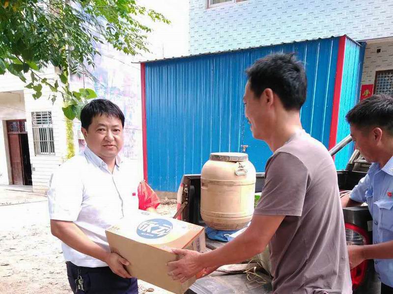 714上午,华阳河三场居民蔡琪将购买的矿泉水、西瓜、肉食及饮料等送上江堤,慰问三场责任段防汛人员,在这骄阳似火、酷暑难耐的炎夏,送来了阵阵清凉