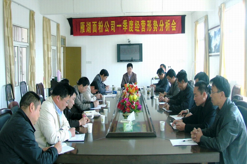 47皖垦食品集团副总经理、雁湖面粉公司董事长缪向阳主持召开雁湖公司一季度经营形势分析会,各分公司经理、本部助理以上管理人员参加会议。