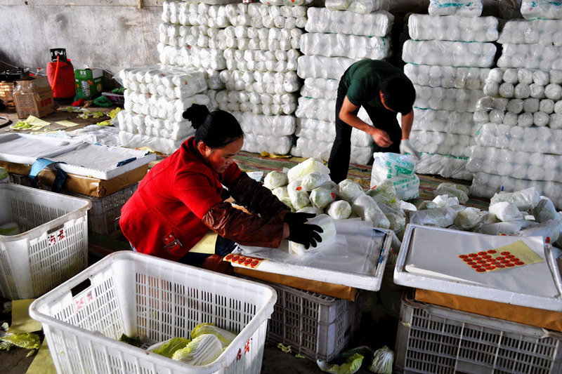 近年来,潘村湖农场通过订单生产、农超对接的模式大力发展果蔬种植业,今年种植的300亩订单娃娃菜于近日开始采摘上市。11月13日,几名职工正在对刚收获的娃娃菜进行精包装,按照预定流程,这批新鲜娃娃菜将在第二天出现在南京、合肥等多家大型超市。据种植户介绍,亩均效益超过4000元,较种植常规作物提高约4倍。(杨登宏)