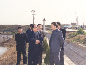 农垦系统2000-2002年农业综合开发工作在省财政关 心支持下,取得了显著成绩,其中华阳河土地治理 项目被评为全省优良工程。图为3月9日,省财政厅 (前左)项仁安副厅长在集团公司田文俊总经理 (前右)陪同下,亲临华阳河农场农业综合开发项 目区检查指导工作。