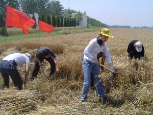 6月3日上午,蚌埠市建委团委、怀远团县委一行14 名团干部来到龙亢农场帮助午收,争进农场与地方 的友谊,体现了共青团的突击队作用。(图为团干 部们正在帮助收割小麦)+ 龙亢农场党群工作部 王 戴群