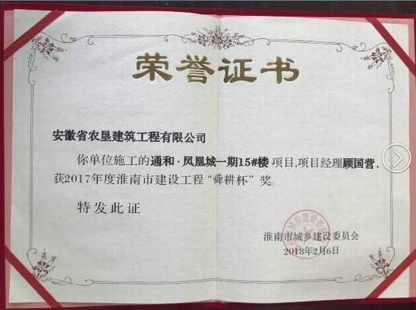 近日,安徽农垦建筑公司承建的通和·凤凰城一期13#15#住宅楼,双双荣获2017年度淮南市建设工程舜耕杯